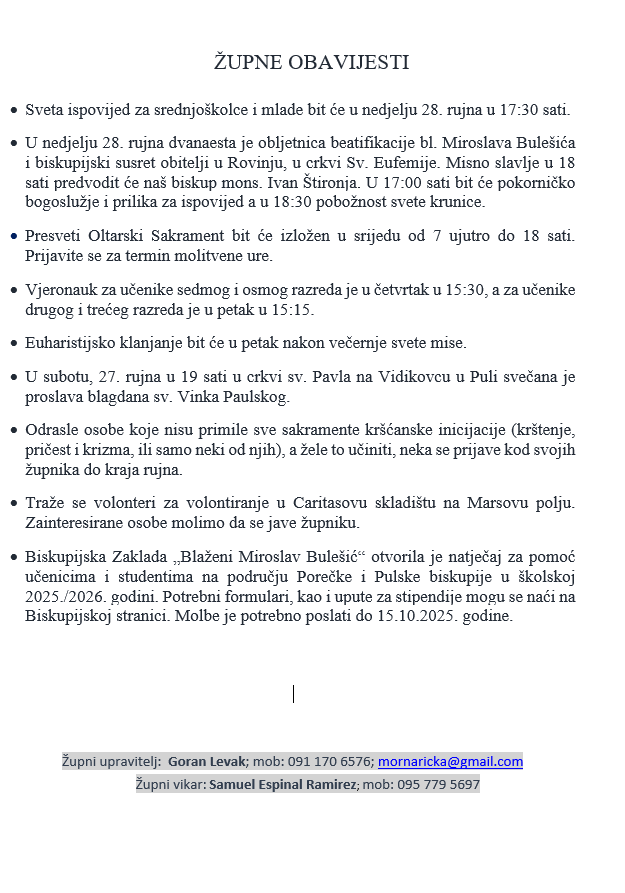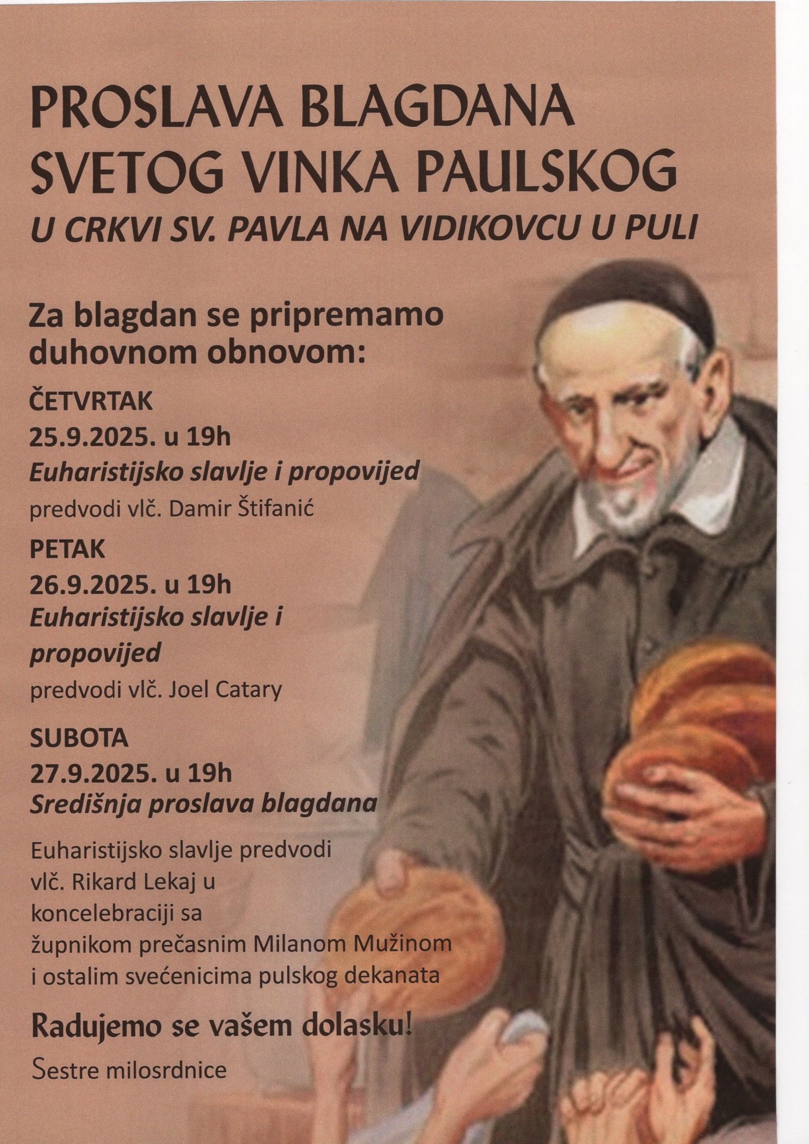 U subotu, 27. rujna u 19 sati u crkvi sv. Pavla na Vidikovcu u Puli svečana je proslava blagdana sv. Vinka Paulskog. Euharistijsko slavlje predvodi vlč. Rikard Lekaj.
